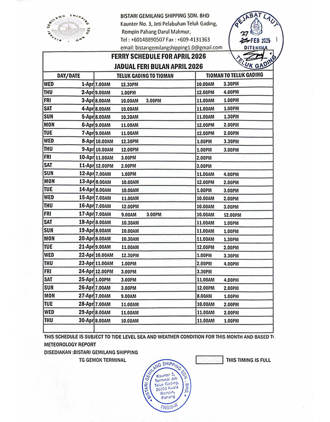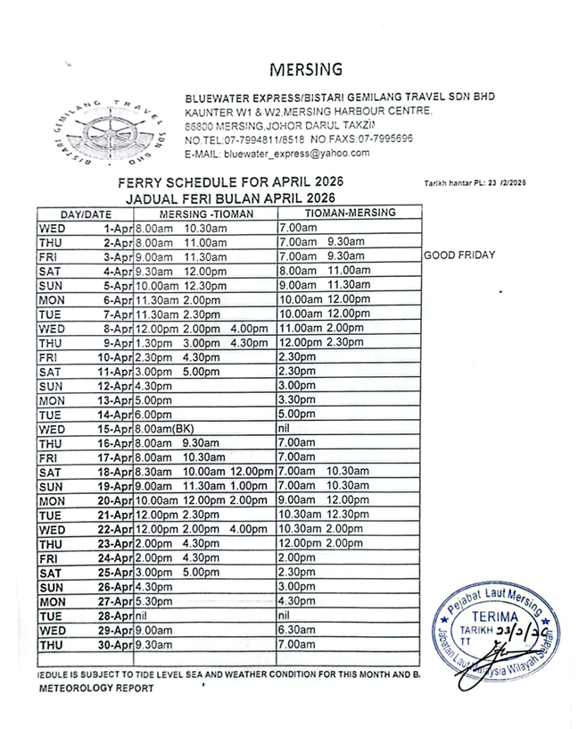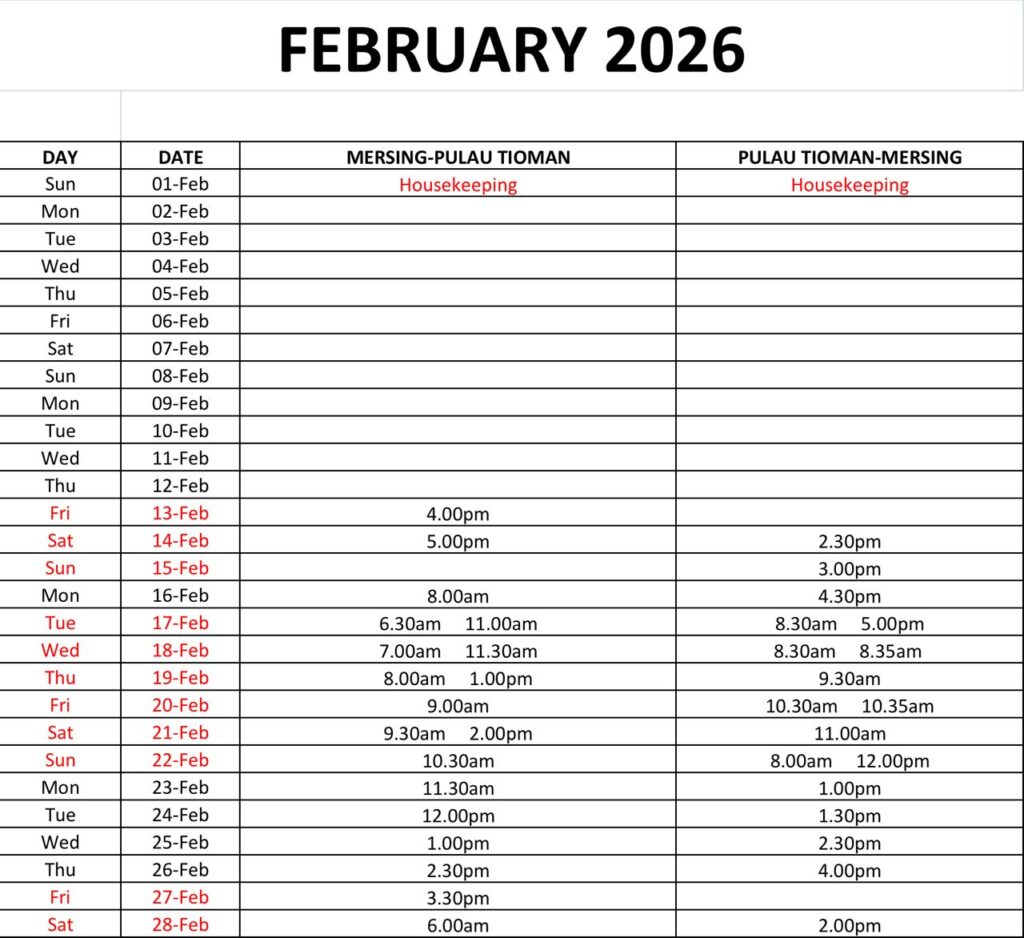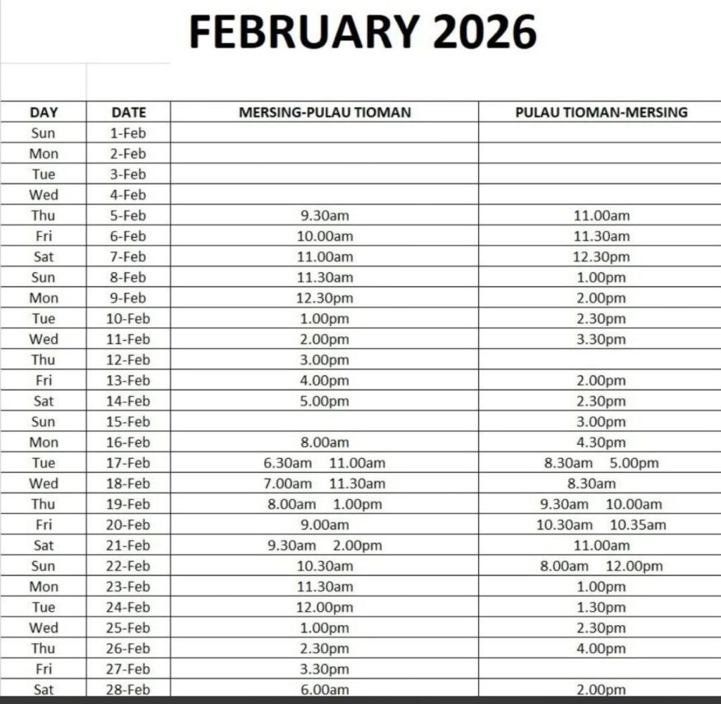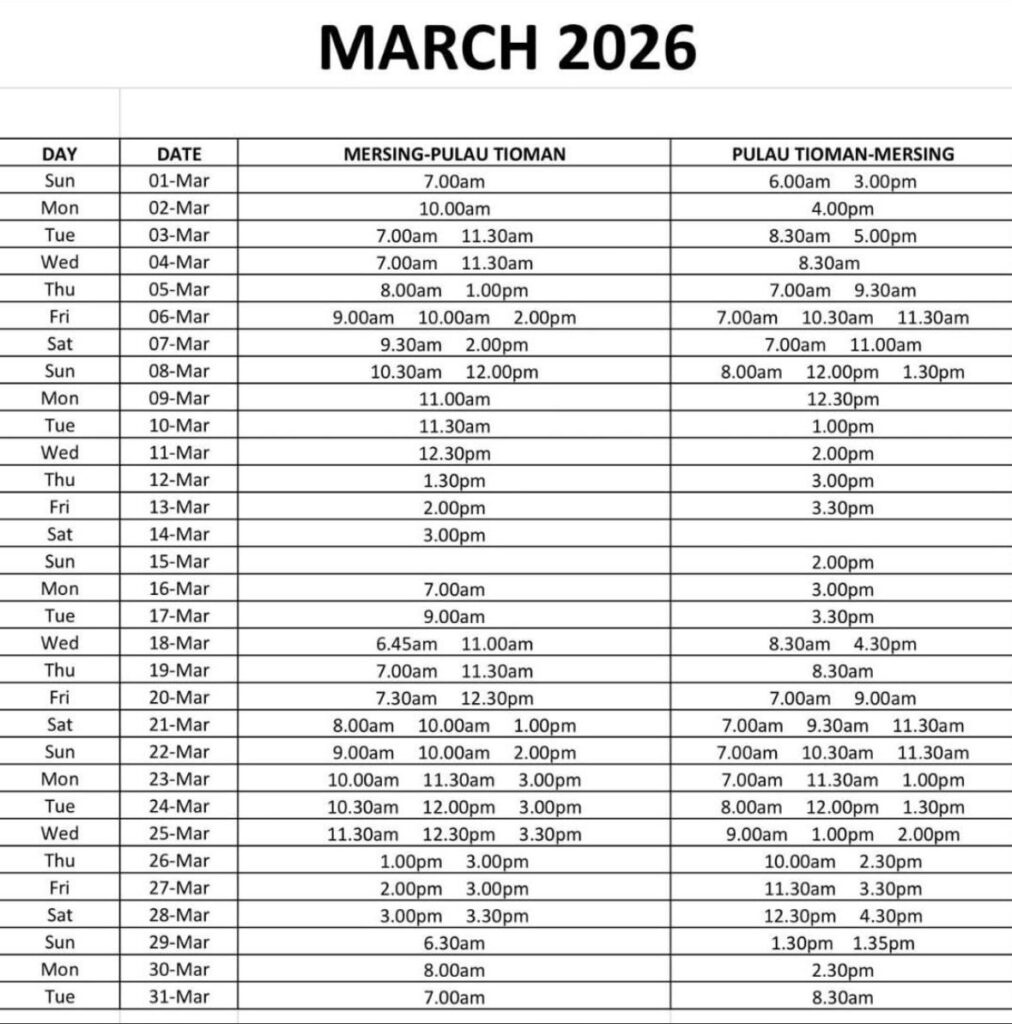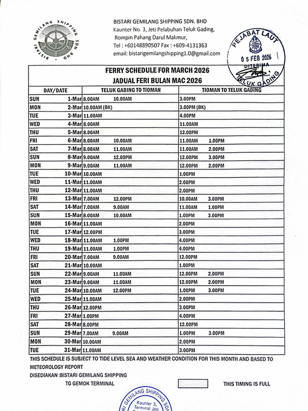 Ferries: Bluewater ferries depart from Mersing in Johor and Tanjung Gemok/Teluk Gading in Pahang. https://bluewater.my/ If you have problem with international payments try this other website instead. https://tiomanferry.com/