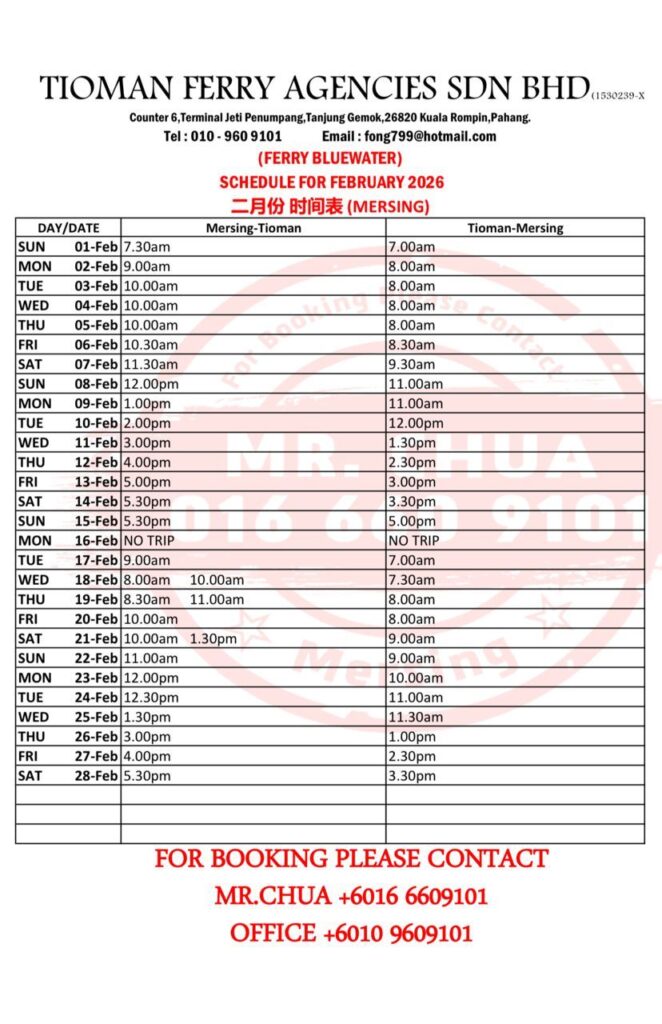 Bluewater Mersing February 2026 Ferry Timetable:
